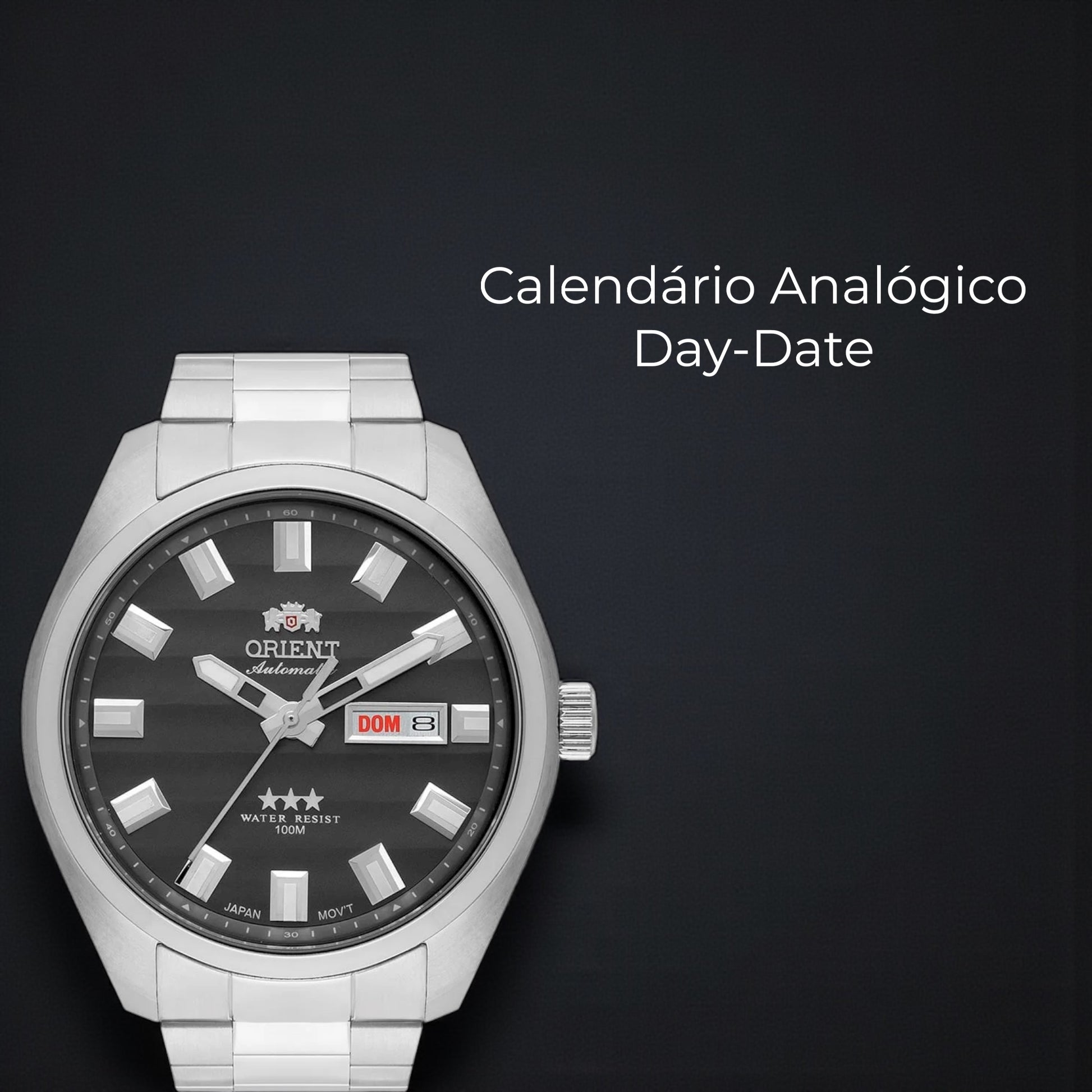 Com calendário analógico duplo, exibe data e dia da semana, oferecendo praticidade e precisão no uso diário.
