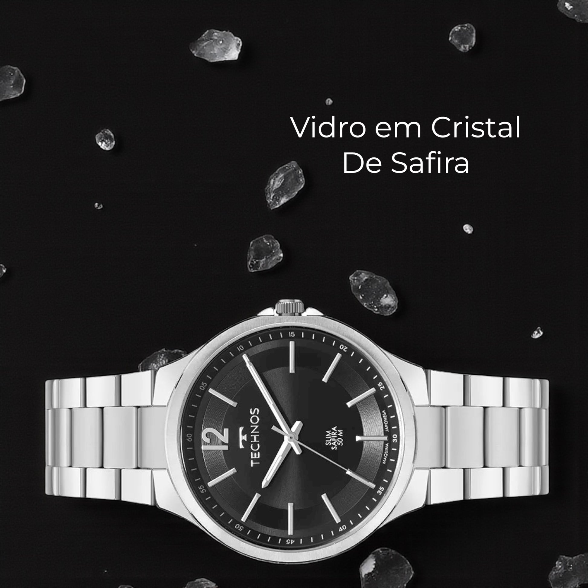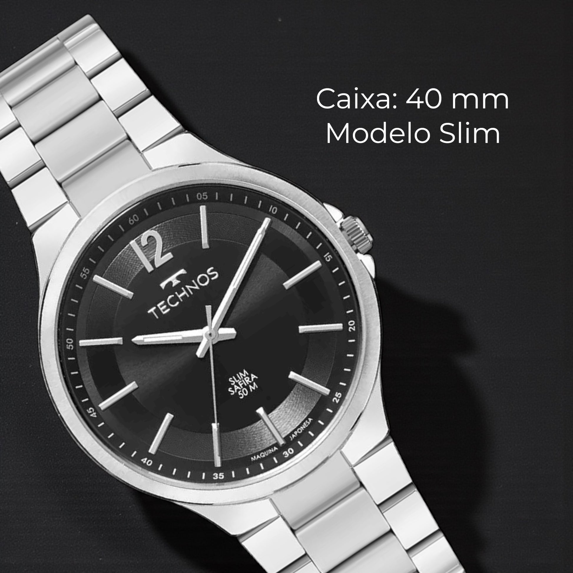 Parte da linha Slim, este modelo se destaca pela caixa ultrafina e pelo mostrador texturizado na cor preta, com numeração arábica na posição de 12 horas e assinatura de linha exclusiva da Technos.